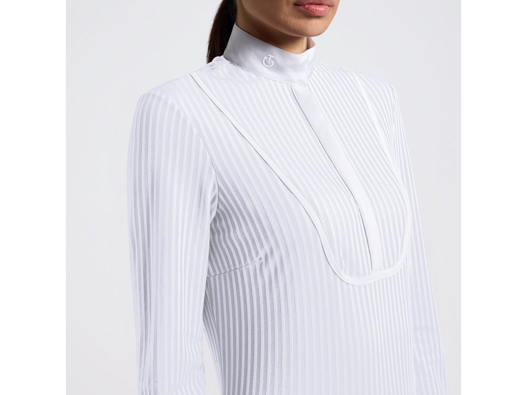 Jazdecká košeľa dámska s pásikmi Cavalleria Toscana s dlhým rukávom kombinuje klasický elegantný dizajn s výnimočnými technickými parametrami. Poskytuje ideálne pohodlie počas jazdy. Elastický materiál s pruhovaným vzorom je priedušný a skvele sa prispôsobí postave. Predná vložka tón v tóne dodáva košeli štruktúru a pekne dopĺňa celkový vzhľad. Nechýba biely popelínový golier a manžety, ktoré nielen dobre vyzerajú, ale sú tiež vyžadované pravidlami pretekov. Táto jazdecká košeľa na preteky Cavalleria Toscana je vynikajúcou voľbou pre tých jazdcov, ktorý chcú dobre vyzerať bez kompromisu s pohodlím a funkčnosťou.