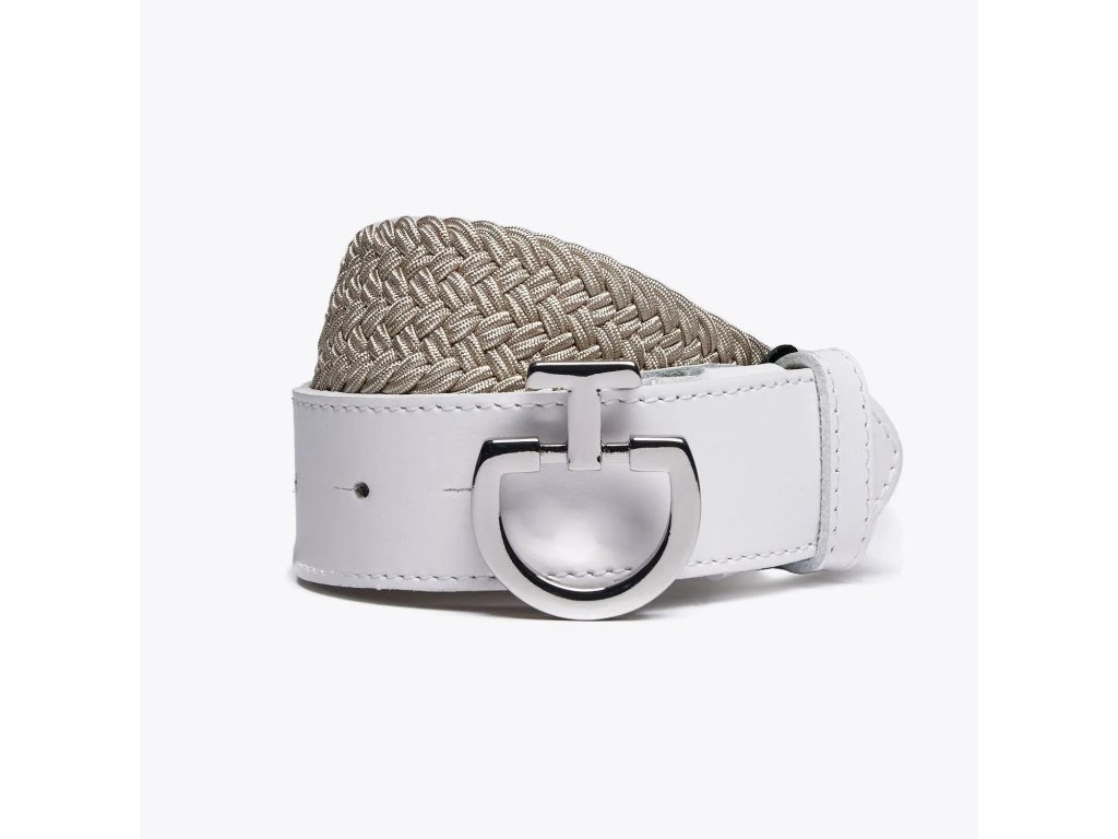 Tento dámsky opasok je vyrobený z elastického hodvábu a je tvorený koženými pásikmi pretkanými cez gumu. Má hladkú koženú špičku a kovovú sponu s logom. Tento pás je tenký a elastický, takže nebude objemný ani nebude obmedzovať pohyb pri športových aktivitách.