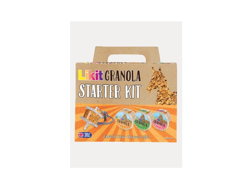 Dajte zbohom nude v boxe! Likit Granola Starter set obsahuje všetko potrebné na zabavenie vášho koňa - 1 držiak na likit a 3 náplne v rôznych príchutiach. Zostavenie je jednoduché. Držiak zavesíte do boxu vášho koňa pomocou priloženého lanka. Nezabudnite vložiť náplň.