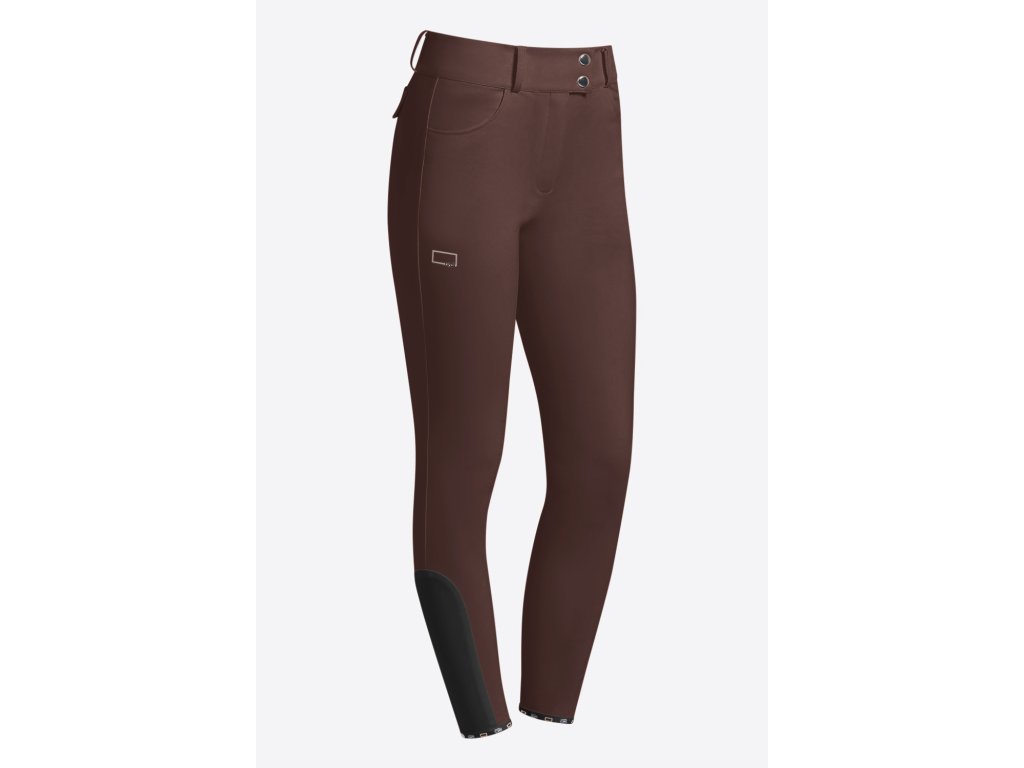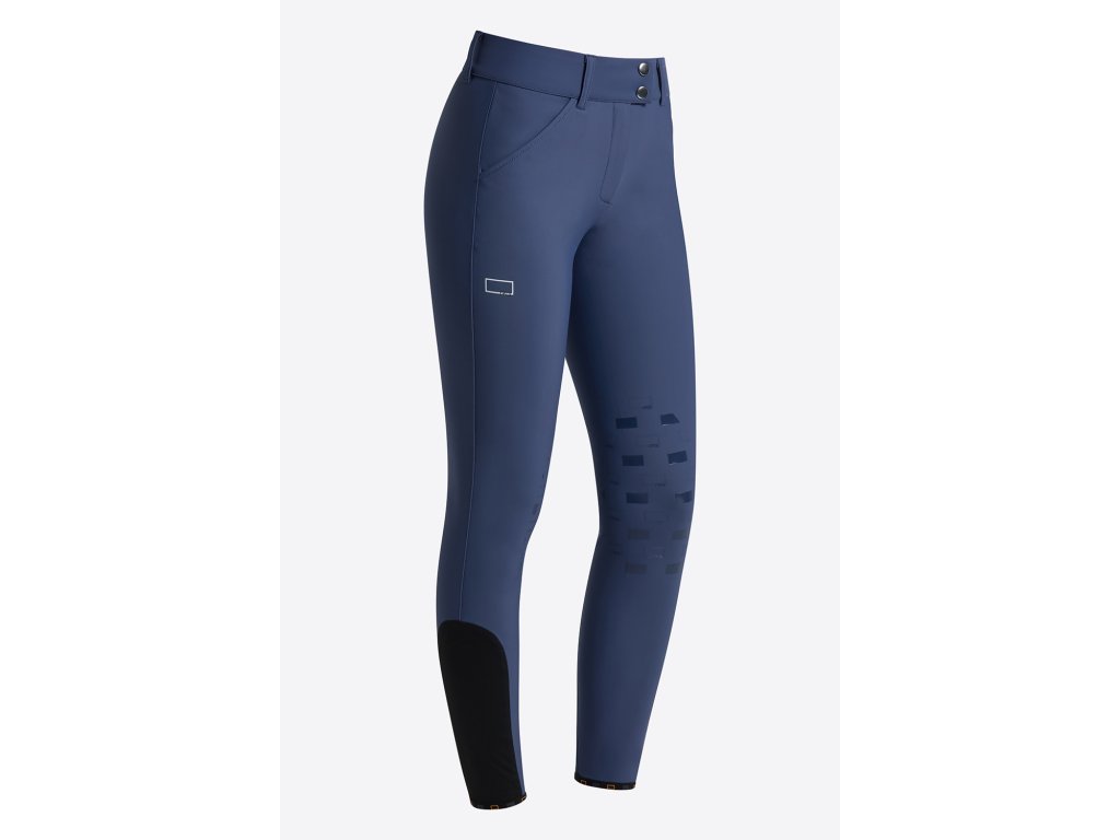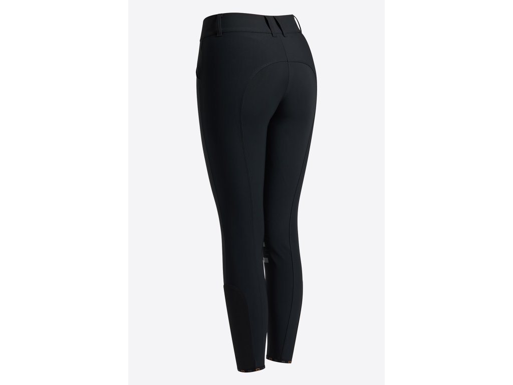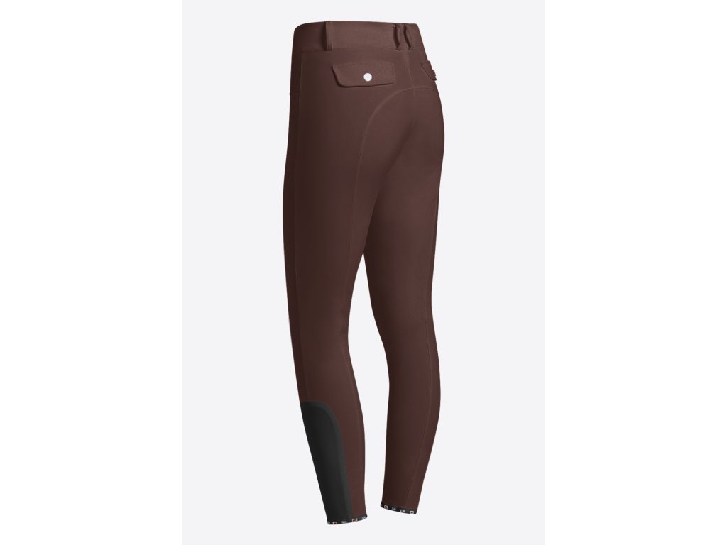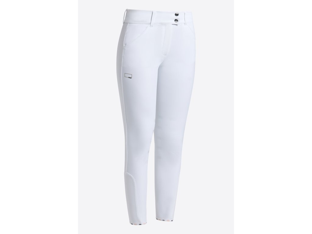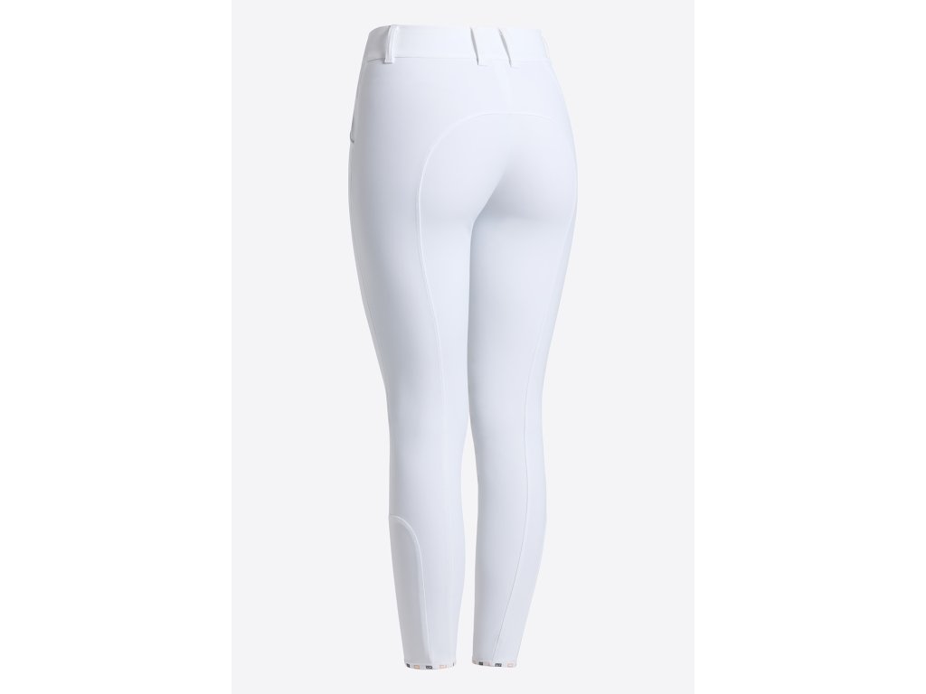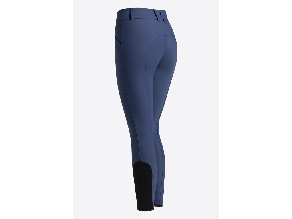 Jazdecké nohavice s vysokým pásom dámske RG sú vyrobené z technickej tkaniny s dvojitým strečom a majú tón v tóne úchyt v oblasti kolien. Ten zaisťuje správne prispôsobenie sedlu. Špeciálnou vlastnosťou tohto modelu je grip skrytý vo vnútri pásu, ktorý je ideálny na lepšie priľnutie ku košeli. Vpredu má zips, ktorý je vystužený dvojitým gombíkom, a veľké slučky, aby sa dali pohodlne nosiť s opaskom. Ponožka v spodnej časti nohavíc obopína lýtko pod topánkou a je priedušná. Kontrastné potlačené logo RG dodáva odevu moderný vzhľad. K dispozícii v rôznych farbách.