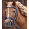 Kožená uzdečka na poníka v čiernej farbe prešíta modrou niťou. Nánosník, nátylník a čelenka mäkko posltrované v stiebornej farbe.
